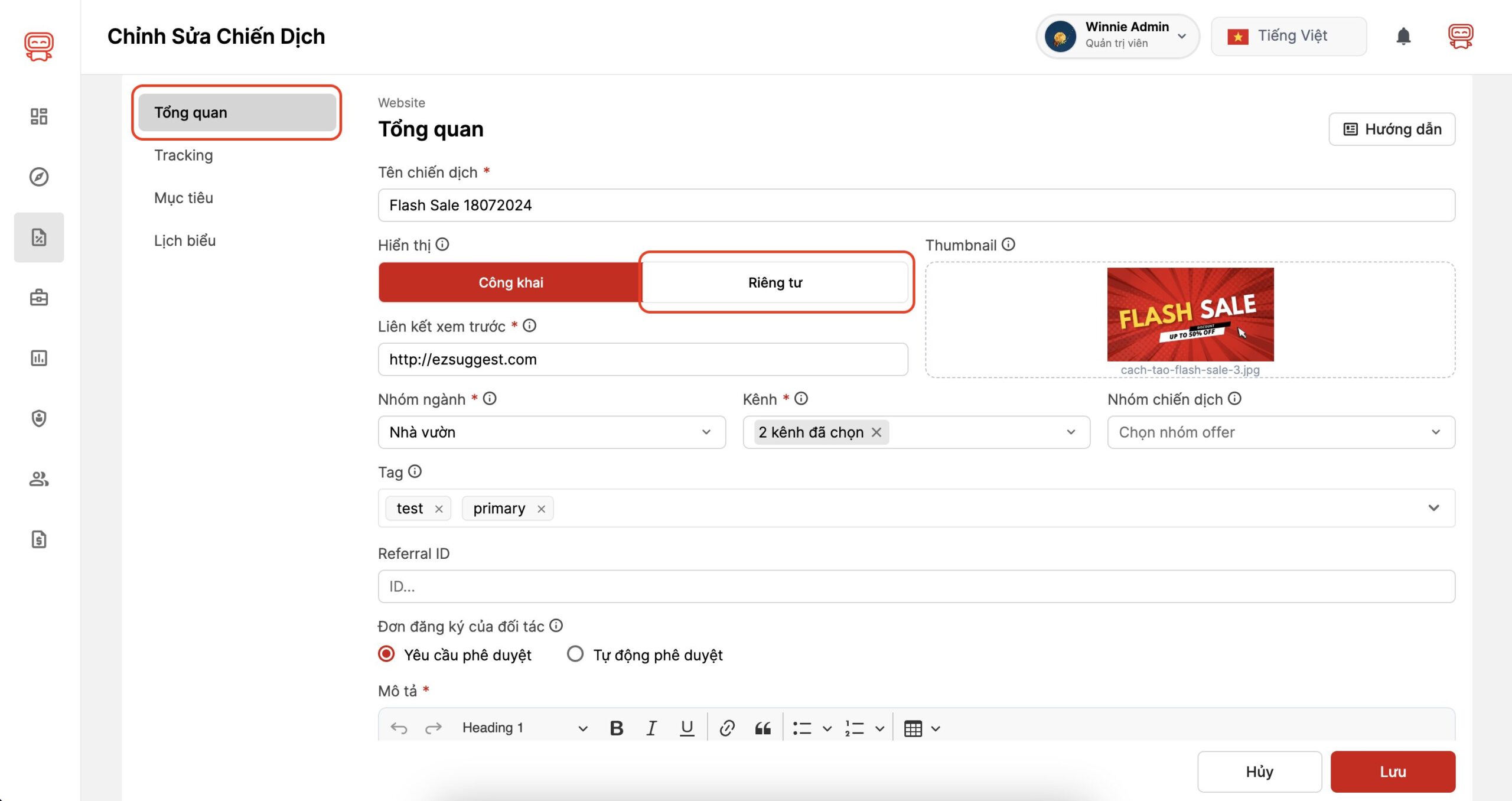 Tại màn hình chỉnh sửa chiến dịch, tab Tổng quan bạn chọn Hiển thị – Riêng tư