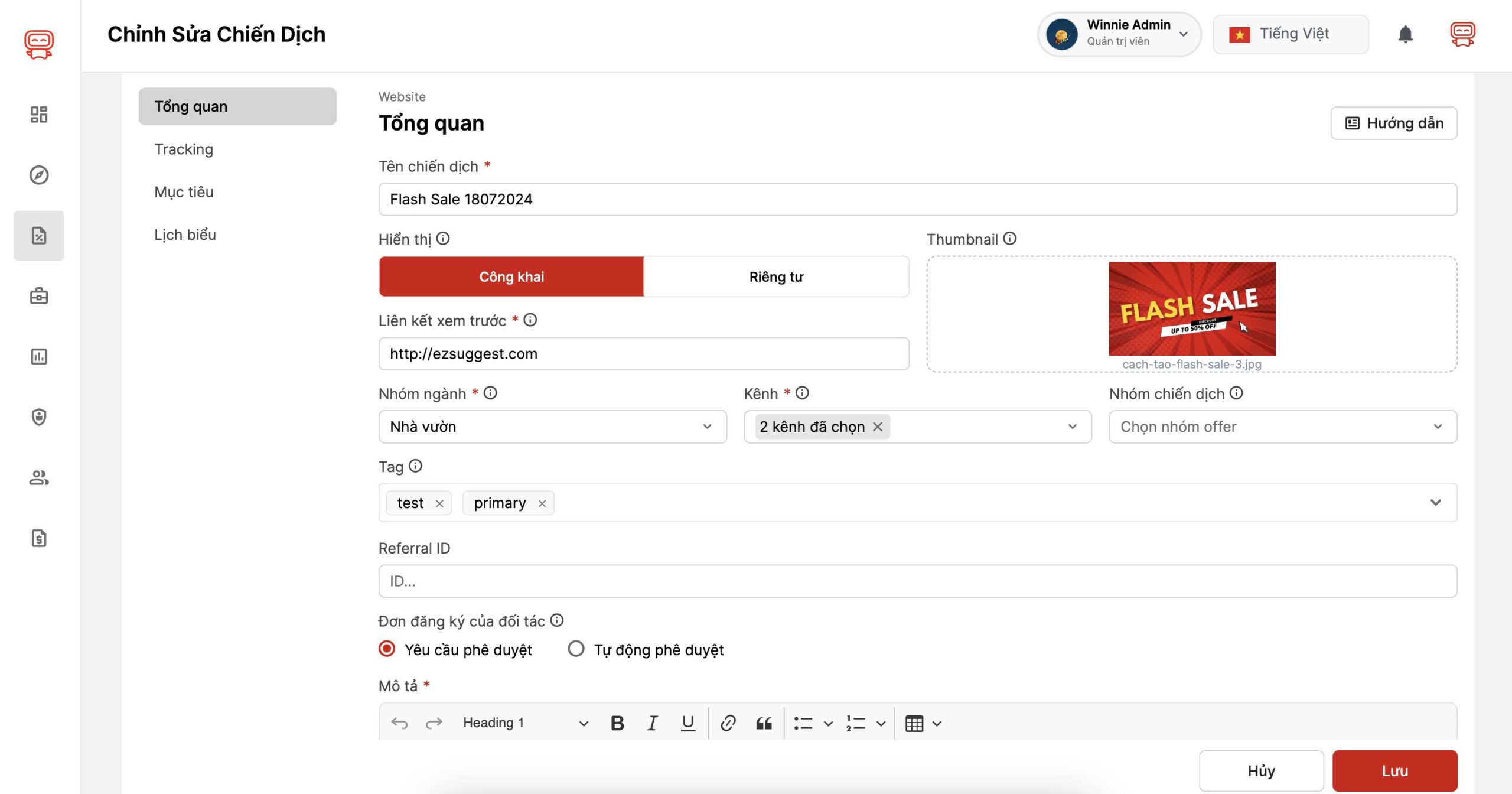 Giao diện chỉnh sửa chiến dịch tại đây tương tự như lúc bạn tạo chiến dịch mới. Một số trường dữ liệu bị vô hiệu hoá, không thể chỉnh sửa được như:
