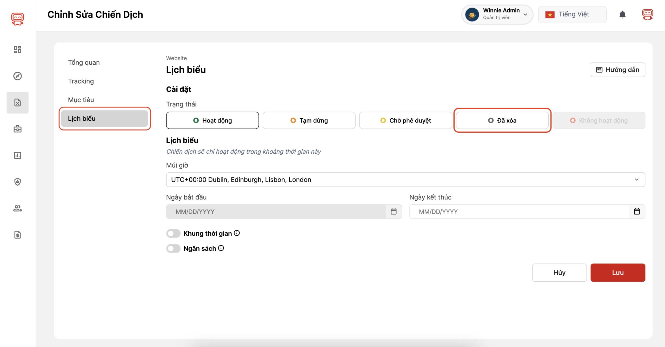 Bạn có thể xoá chiến dịch bằng cách thay đổi trạng thái của chiến dịch thành đã xoá. Chỉ là thay đổi trạng thái của chiến dịch chứ không phải xoá hoàn toàn (sau khi chuyển đổi trạng thái xoá, chiến dịch vẫn còn tồn tại). Cách thực hiện xoá chiến dịch:
