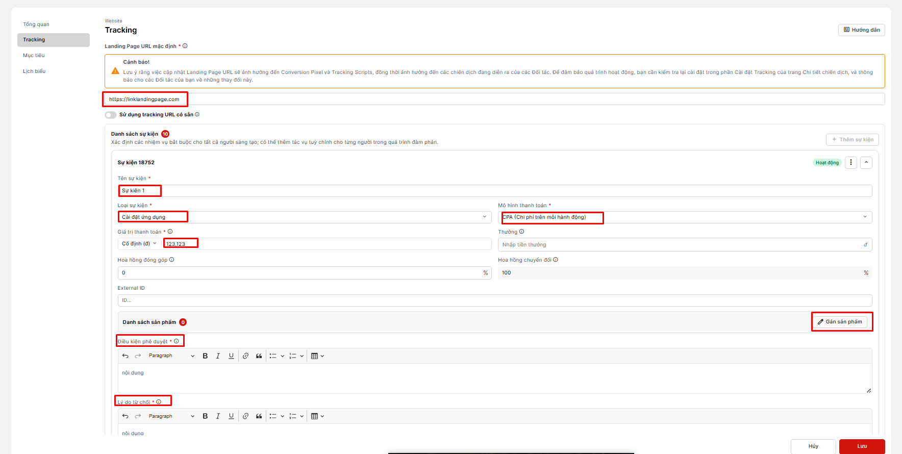 - Landing page URL mặc định: Nhập liên kết của sản phẩm/dịch vụ bạn muốn quảng bá vào đây. Ưu tiên trang mà bạn muốn thu hút lượng truy cập.