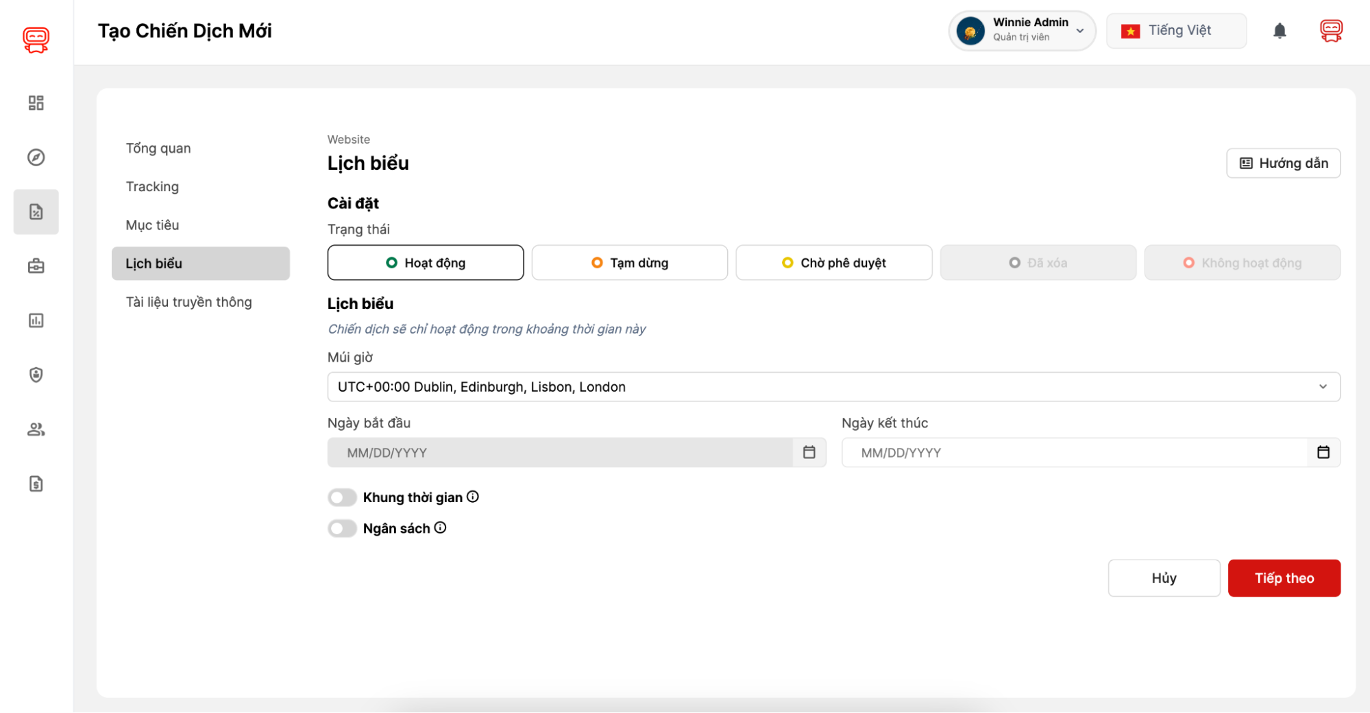 - Cài đặt ngày bắt đầu và kết thúc của chiến dịch.