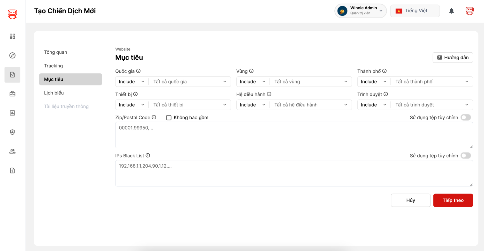 - Đặc điểm thiết bị (Loại thiết bị, hệ điều hành và trình duyệt): Mặc định sẽ chọn tất cả. Bạn có thể thay đổi theo cài đặt riêng.