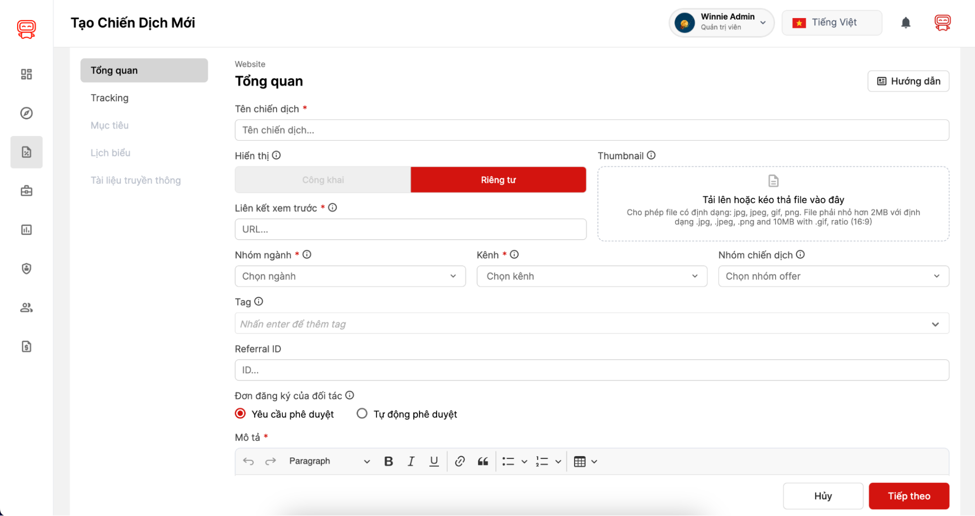 - Thumbnail: Bạn sẽ tải lên một hình ảnh đại diện cho chiến dịch, ảnh này sẽ hiển thị trên Market (Thị trường) của Đối tác affiliate. Ảnh tỉ lệ 16:9 và định dạng .jpg, .png, .jpeg.