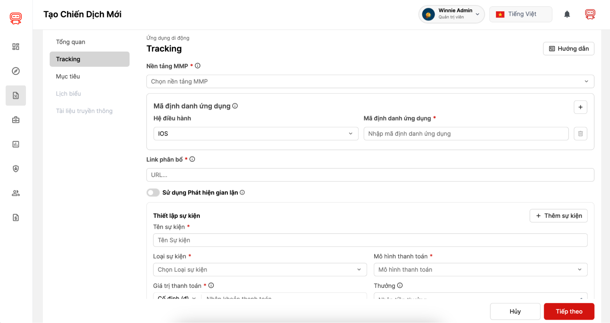- Tại mục Cài đặt tracking, bạn cần điền các trường thông tin sau:
