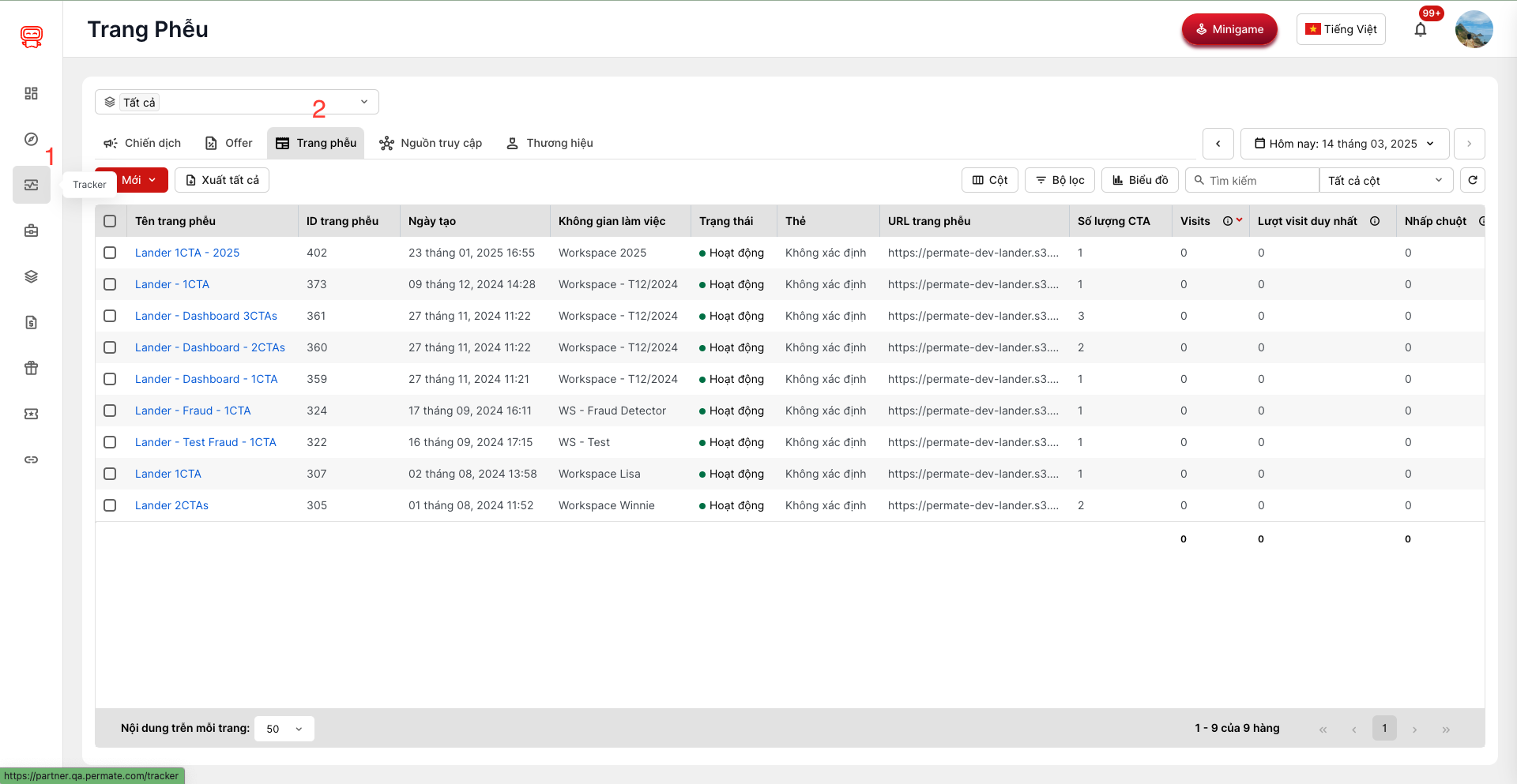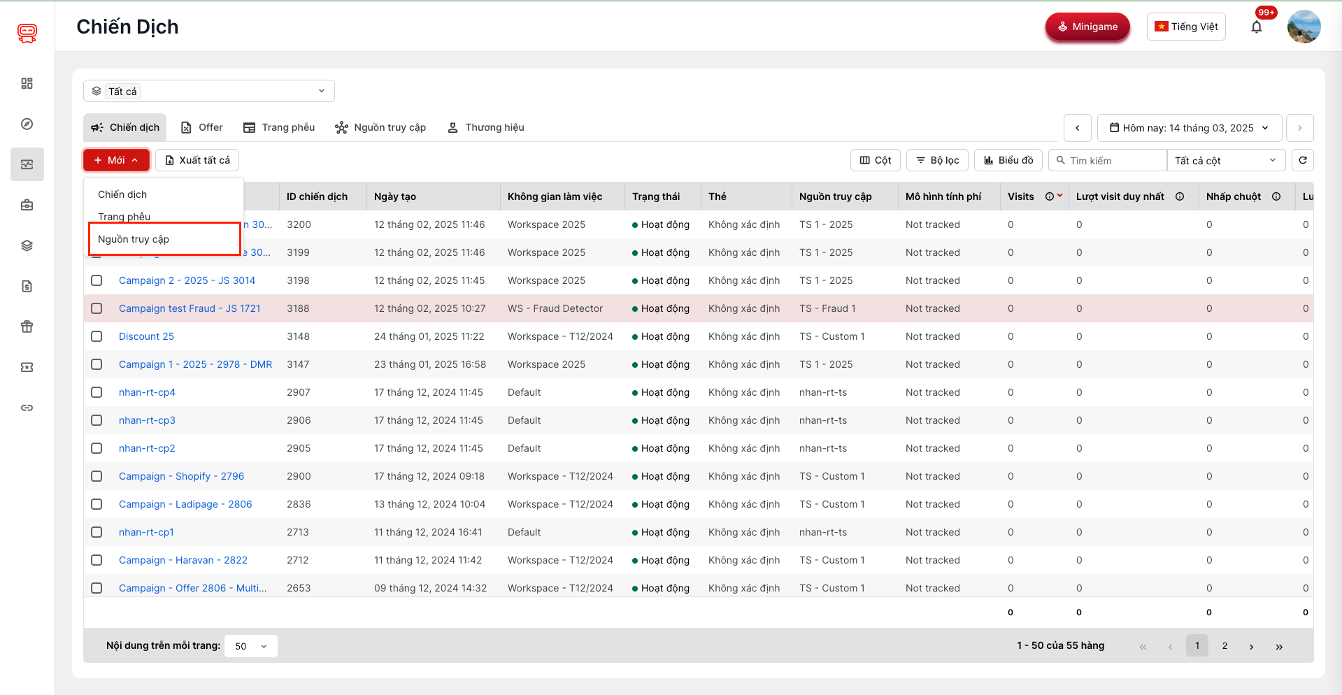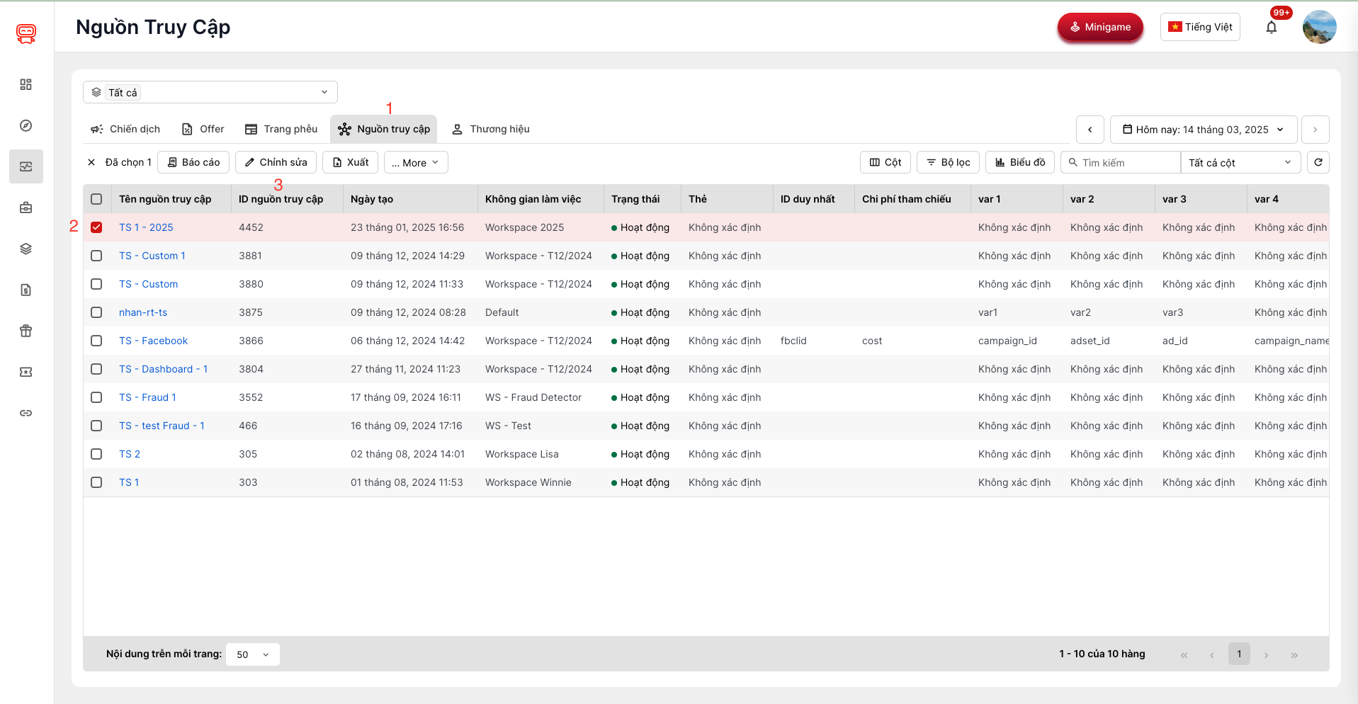 - Danh sách các đối tượng bao gồm chiến dịch, nguồn truy cập, trạng phễu,…