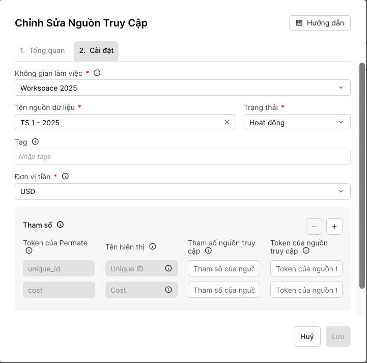 - Cấu hình tham số (Token của Permate,Tên hiển thị, Tham số nguồn truy cập, Token của nguồn truy cập)