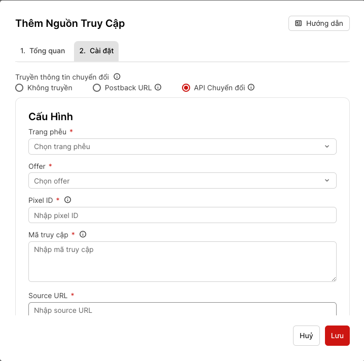 ⚠️ Lưu ý : Trong template nguồn truy cập, hiện chỉ hỗ trợ hai loại là Facebook Ads và TikTok Ads. Khi thêm thông tin API chuyển đổi trong phần truyền thông tin chuyển đổi, trong Tab Cài đặt.