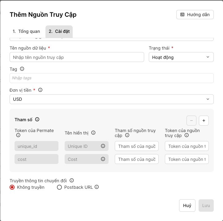 - Tham số: Bạn có thể xác định dữ liệu nào sẽ được truyền từ nguồn truy cập đến Permate. Kiểm tra các hướng dẫn để xác định các tham số và token được hỗ trợ. Bạn có thể thêm tối đa 10 tham số. Những tham số này được sử dụng để tạo liên kết tracking.