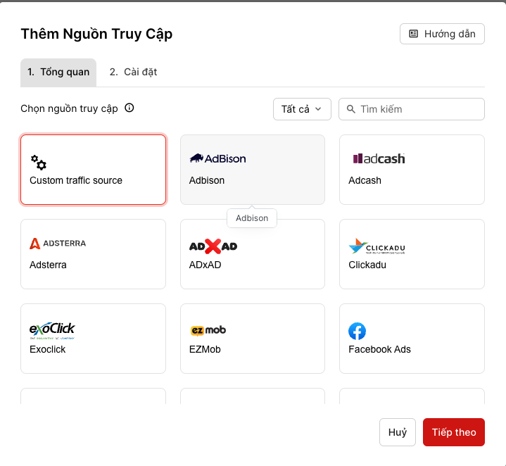 - Cung cấp danh sách Template dễ dàng thiết lập nhanh nguồn truy cạp hoặc tạo “Custom traffic source” nếu template không phù hợp.