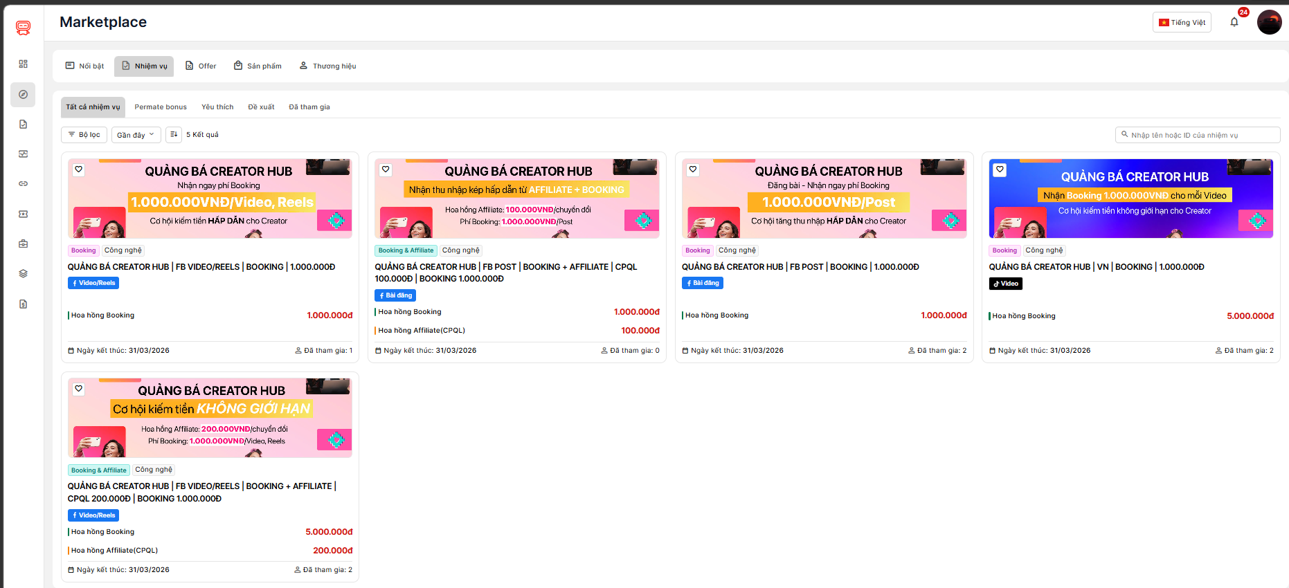 - Sau khi đăng nhập tài khoản Creator, bạn truy cập vào tab Marketplace. Đây là trung tâm hiển thị tất cả các chiến dịch (Campaign) đang hoạt động từ các nhãn hàng.