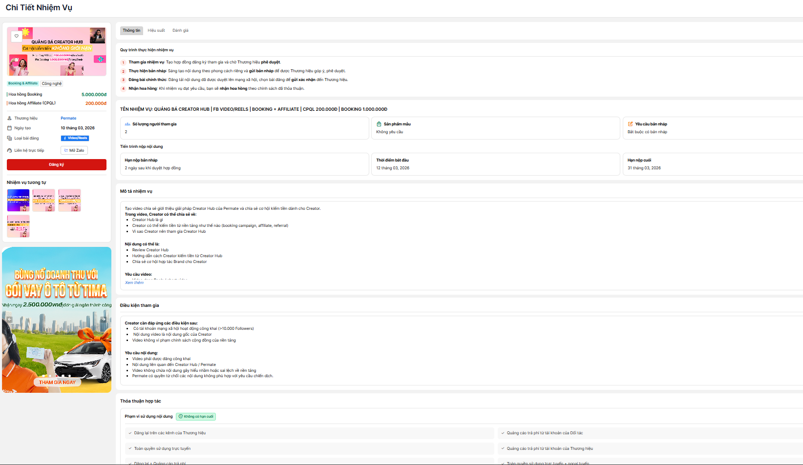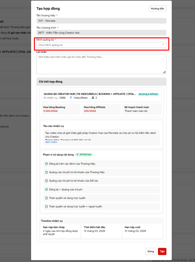 - Khởi tạo Hợp đồng: Hệ thống sẽ tự động tạo một hợp đồng điện tử. Bạn cần kiểm tra lại các điều khoản cam kết giữa bạn và nhãn hàng, sau đó xác nhận để chính thức bắt đầu nhiệm vụ.
