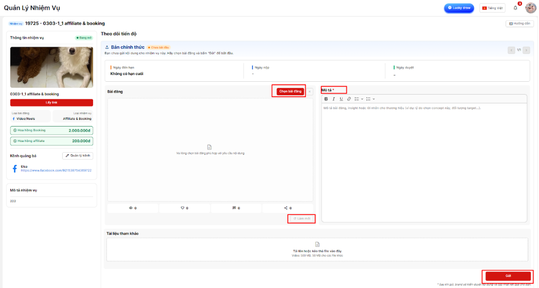 💡 Lưu ý nhỏ: Bạn nên nhấn nút Refresh ngay trước khi gửi nhiệm vụ để đảm bảo Brand thấy được kết quả hoạt động tốt nhất của bạn!