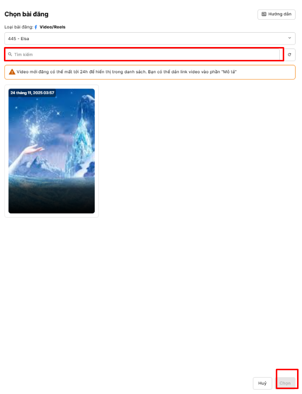 - Tìm kiếm bài viết: Bạn có thể lướt danh sách hoặc dùng thanh tìm kiếm để chọn đúng bài đăng có nội dung quảng bá cho nhãn hàng.
