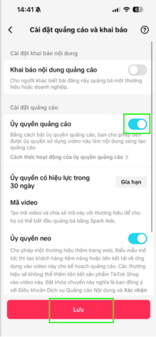 Gạt thanh trạng thái tại mục Ủy quyền quảng cáo (Ad authorization) sang màu xanh.