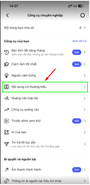 Bước 2: Tìm và chọn mục Nội dung có thương hiệu (Branded Content).
