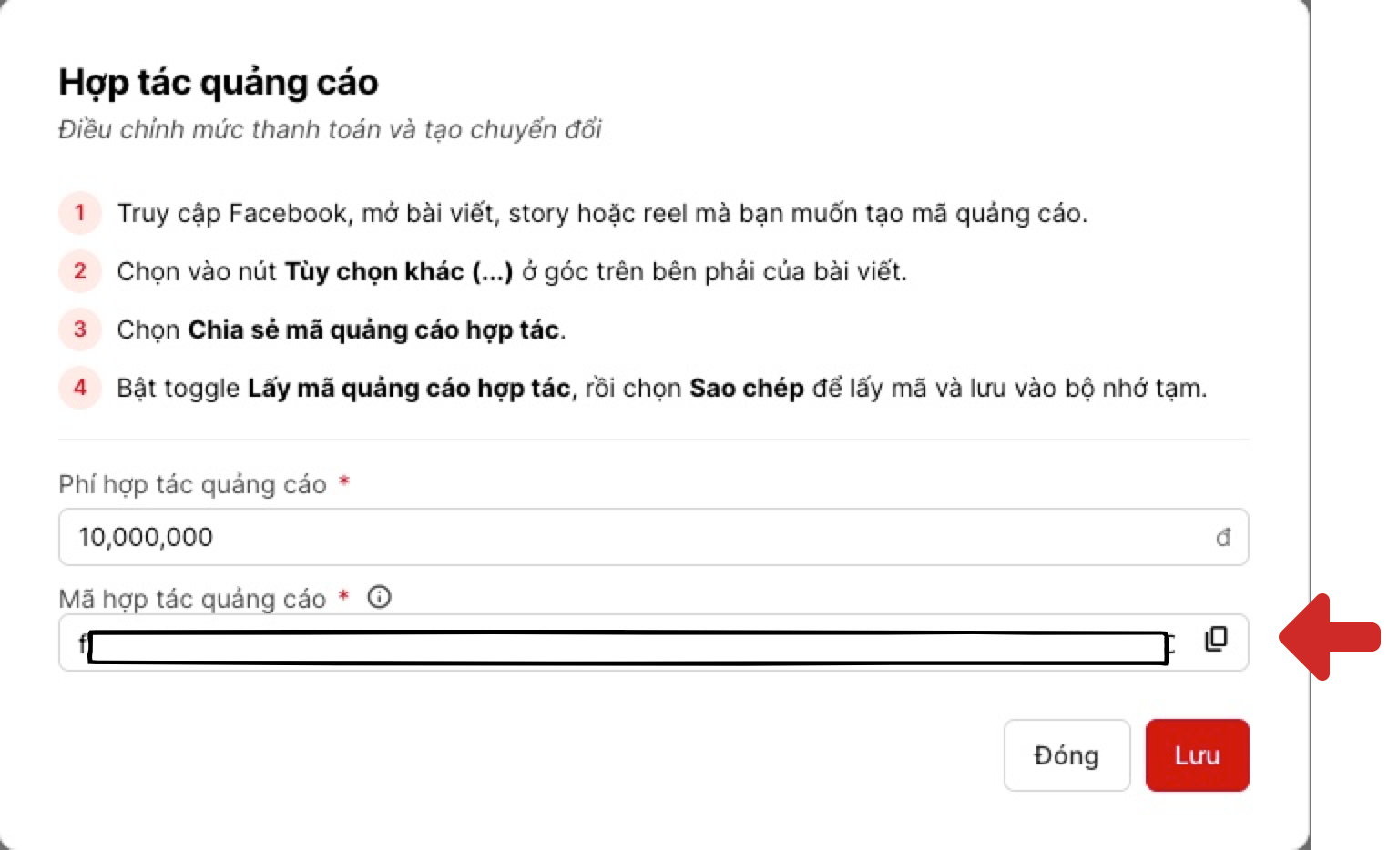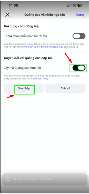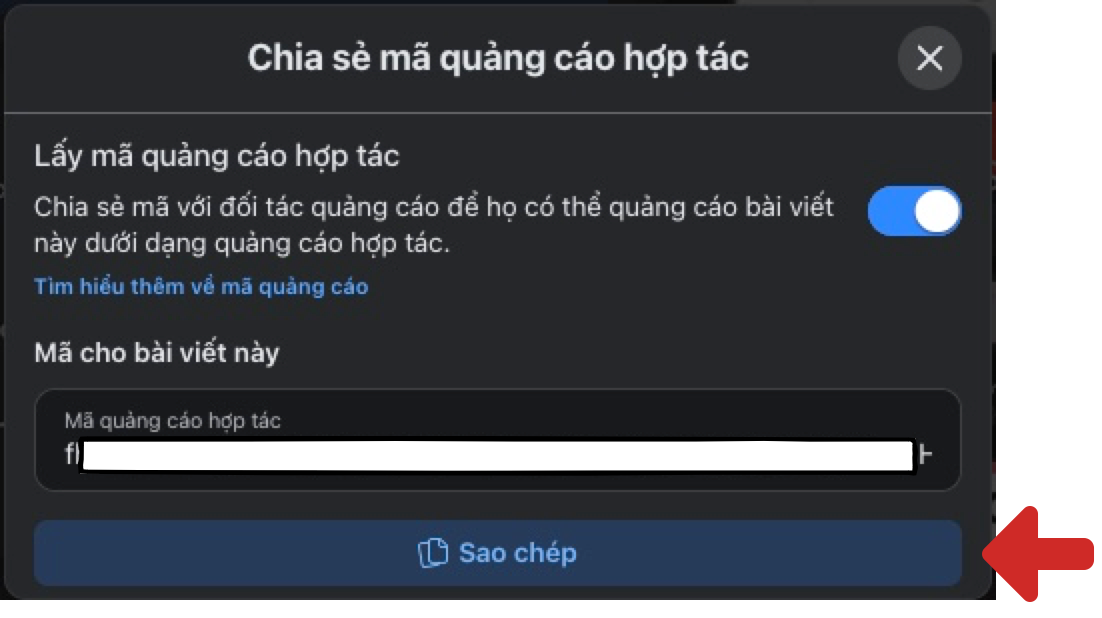 Chọn “Chia sẻ mã quảng cáo hợp tác”