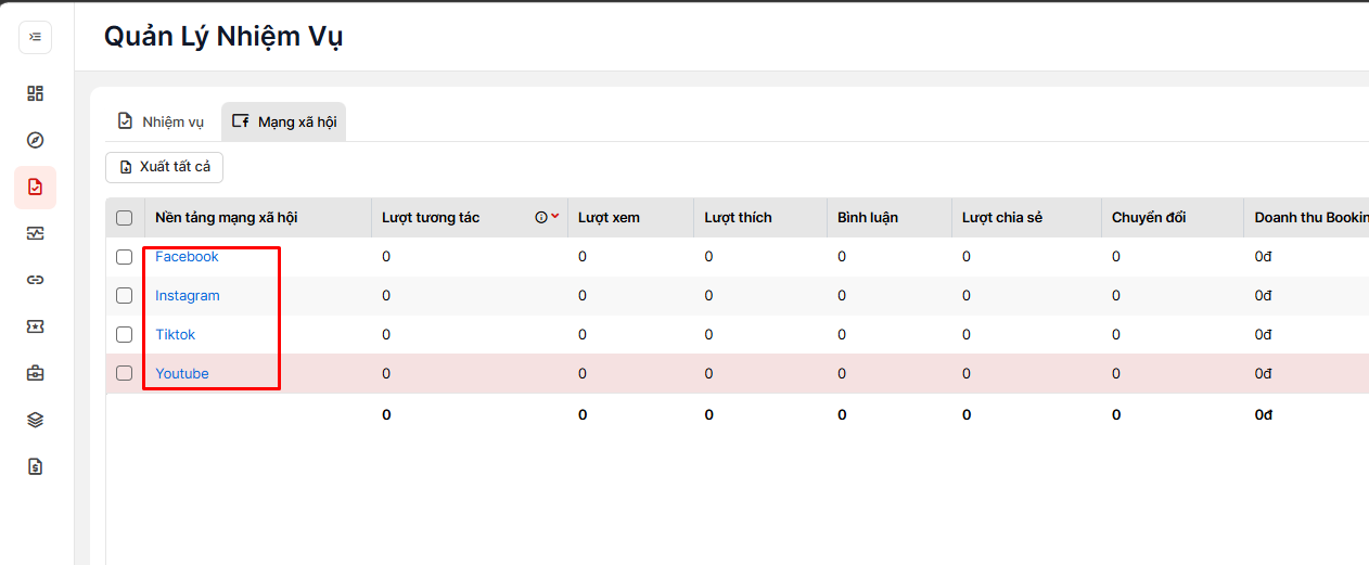 Khi chọn một nền tảng, hệ thống sẽ hiển thị tất cả các nhiệm vụ liên quan đến nền tảng đó.