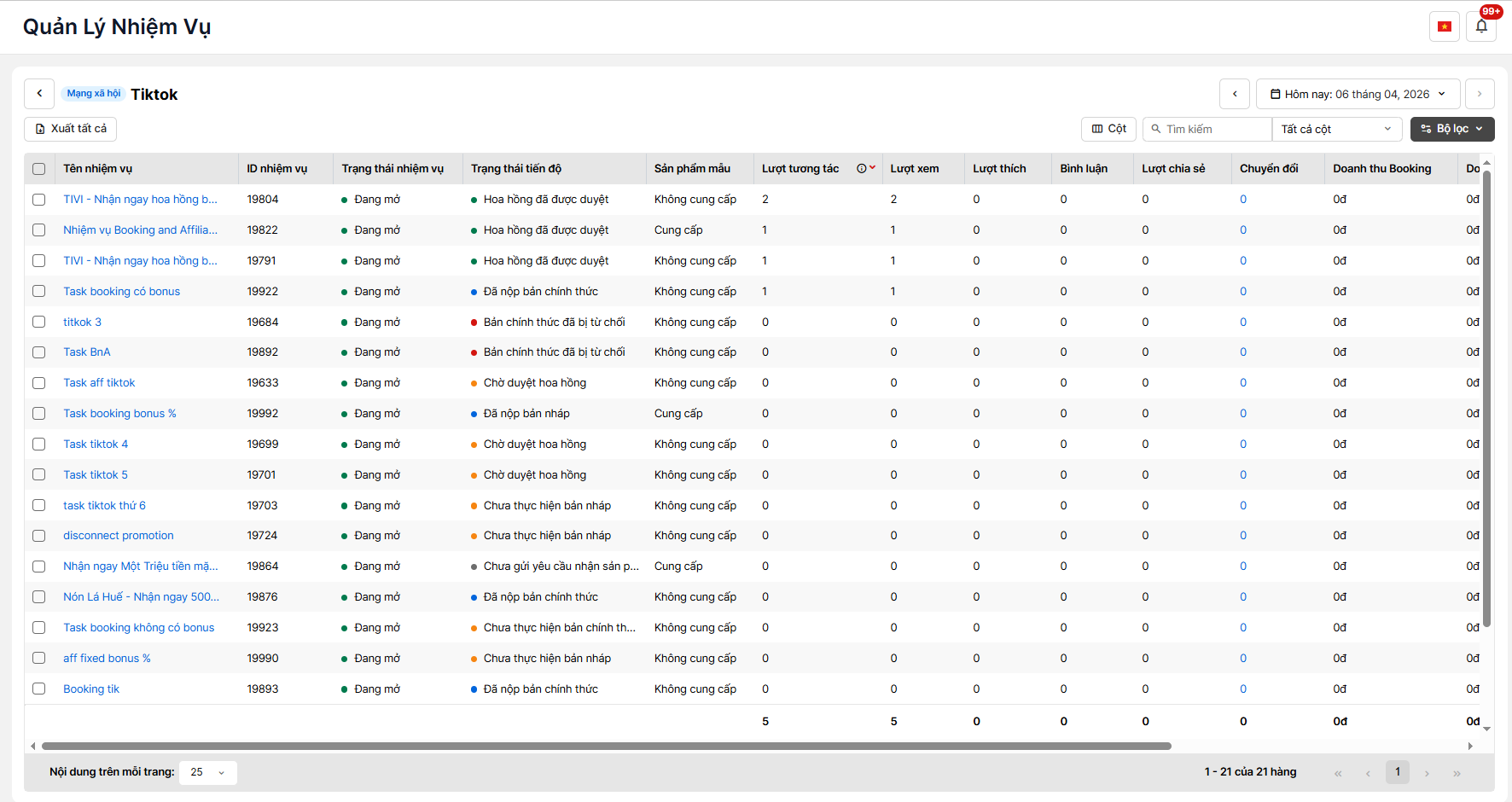 Danh sách nhiệm vụ được hiển thị dưới dạng bảng với nhiều cột thông tin khác nhau.