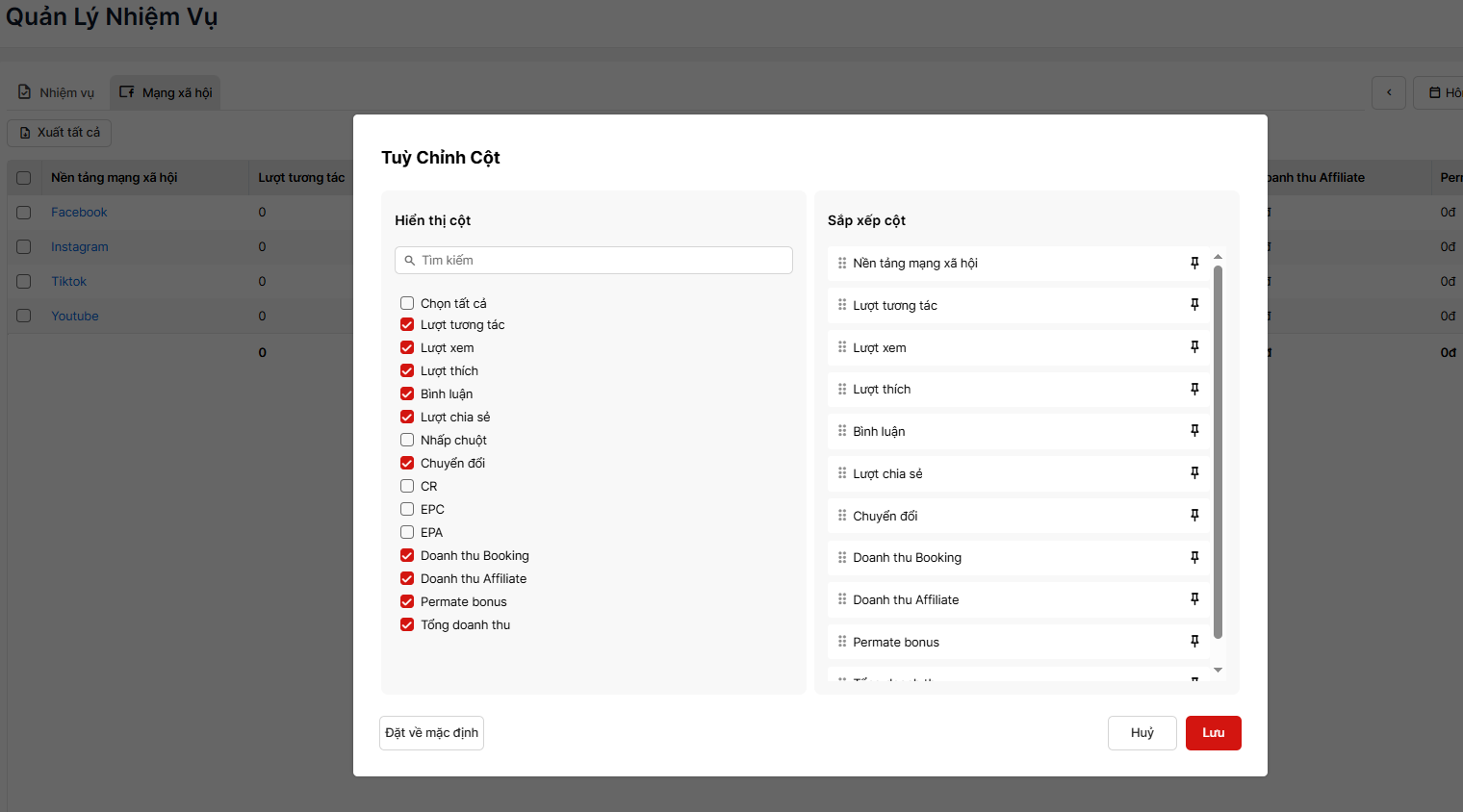 Bạn có thể bật hoặc tắt các cột để bảng dữ liệu hiển thị gọn gàng và phù hợp với nhu cầu theo dõi của mình.