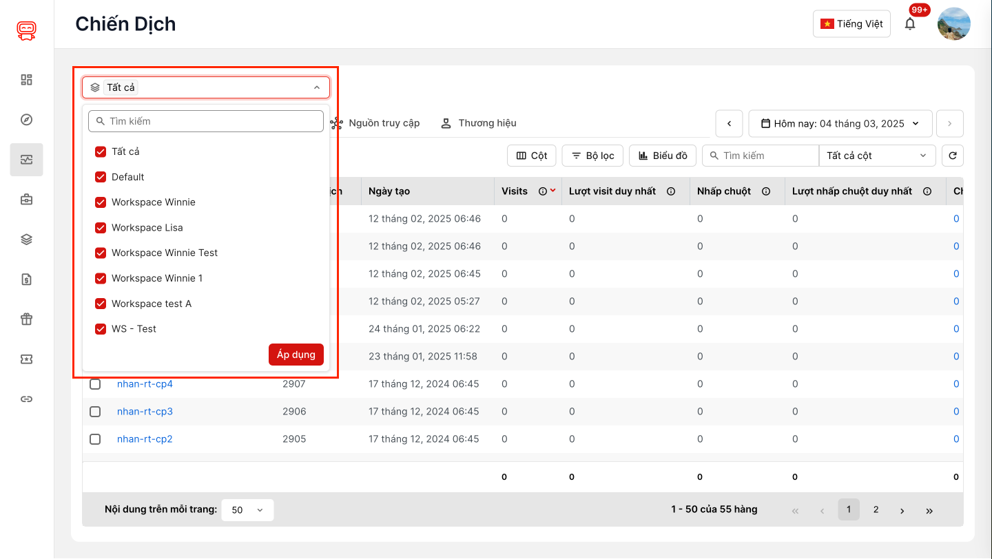 ⚠️ Lưu ý : Việc thay đổi không gian làm việc sẽ ảnh hưởng đến dữ liệu hiển thị trong các dropdown khác như traffic_dropdown, Tạo mới Chiến dịch, trang phễu và nguồn truy cập.. Nếu không gian làm việc chưa được chọn, các dropdown này sẽ hiển thị “không có dữ liệu”.