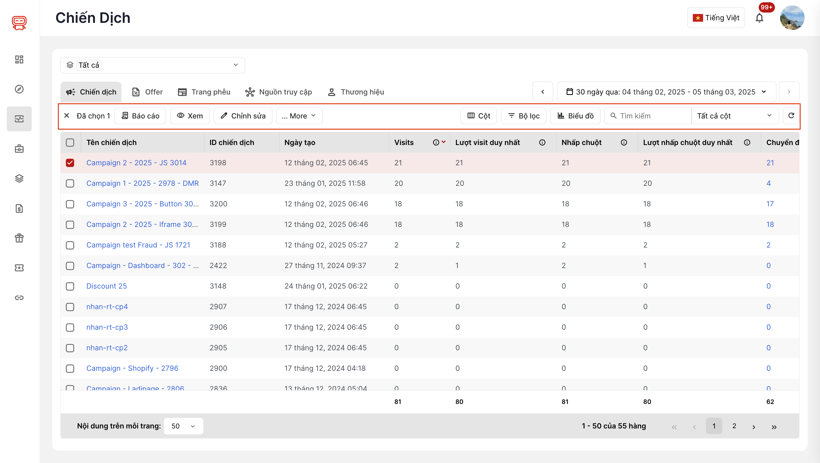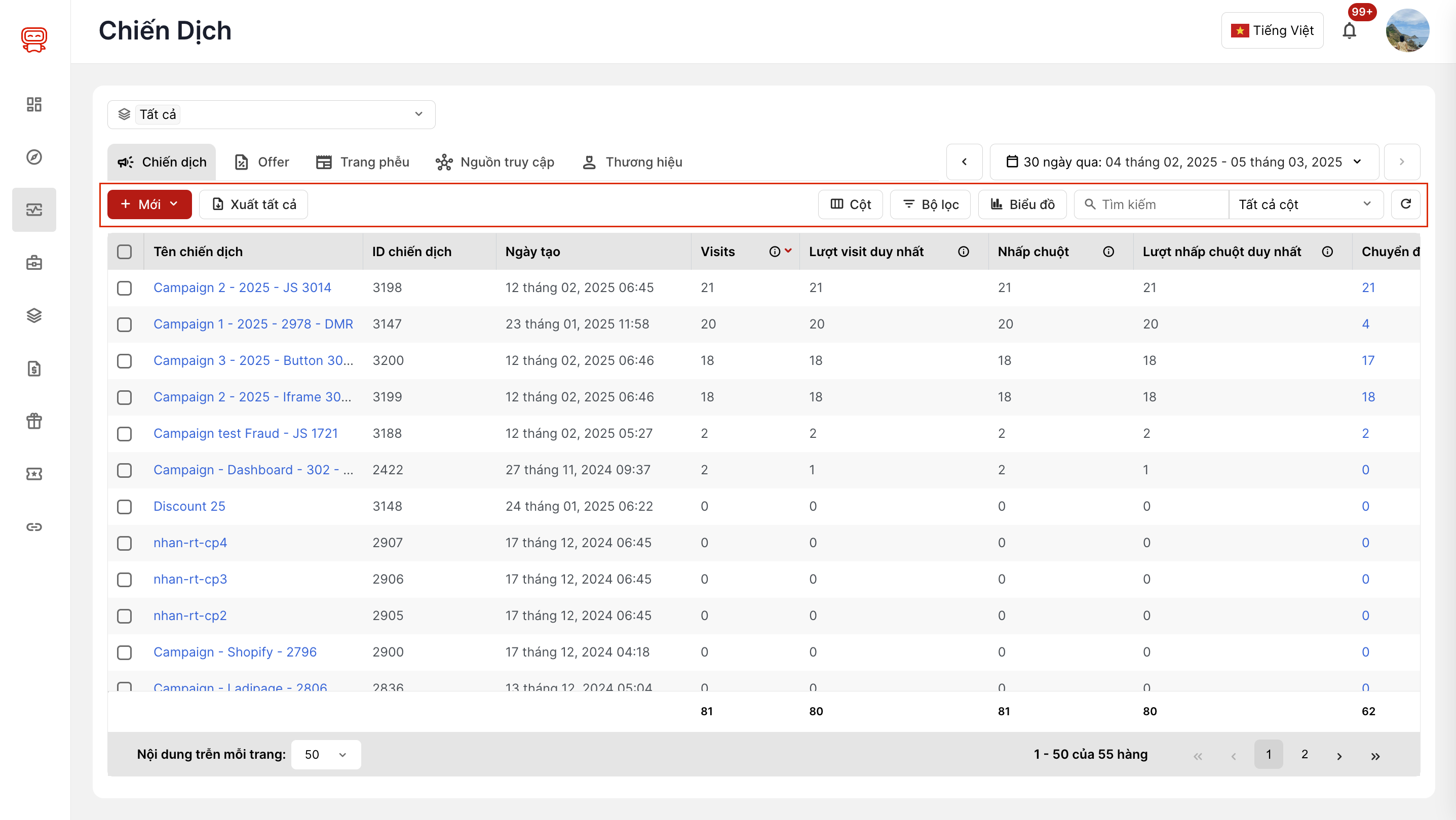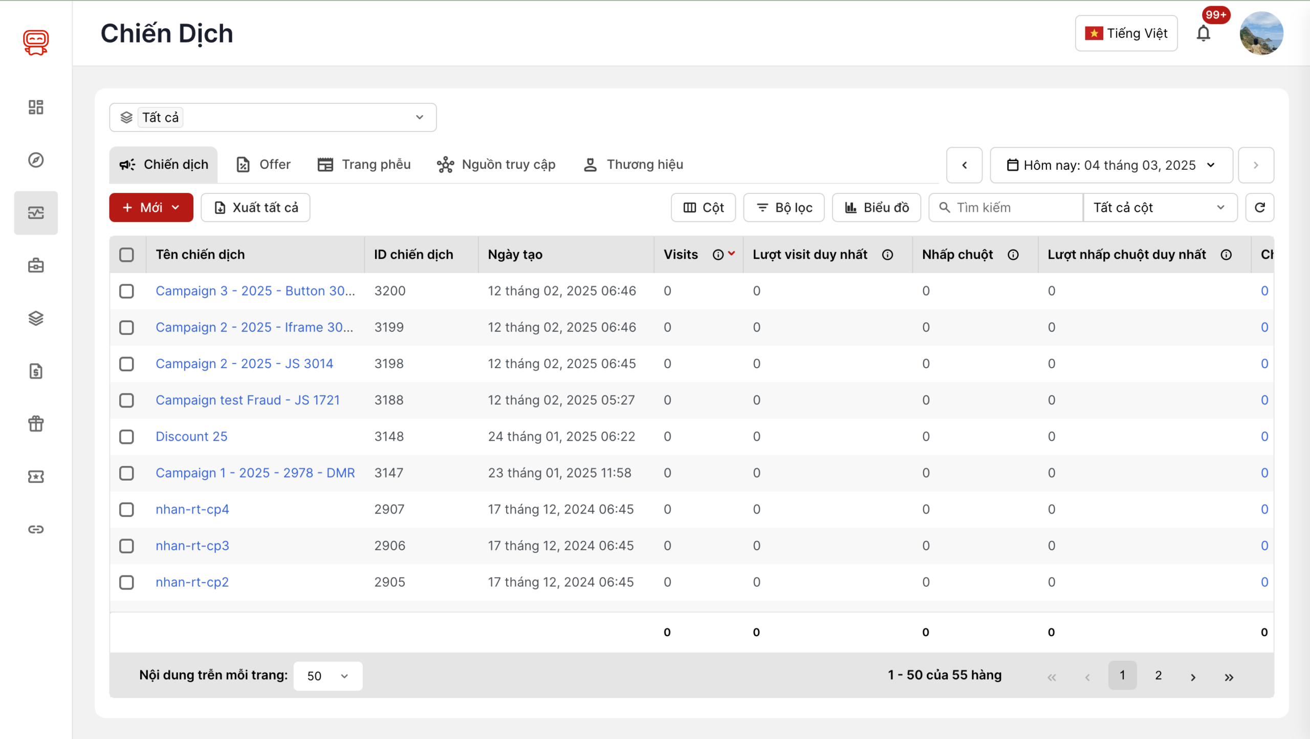 - Filter Tab: Cho phép bạn chọn các bộ lọc khác nhau để xem dữ liệu theo các tiêu chí như Chiến dịch, Offer, Trang phễu, Nguồn truy cập, Thương hiệu.