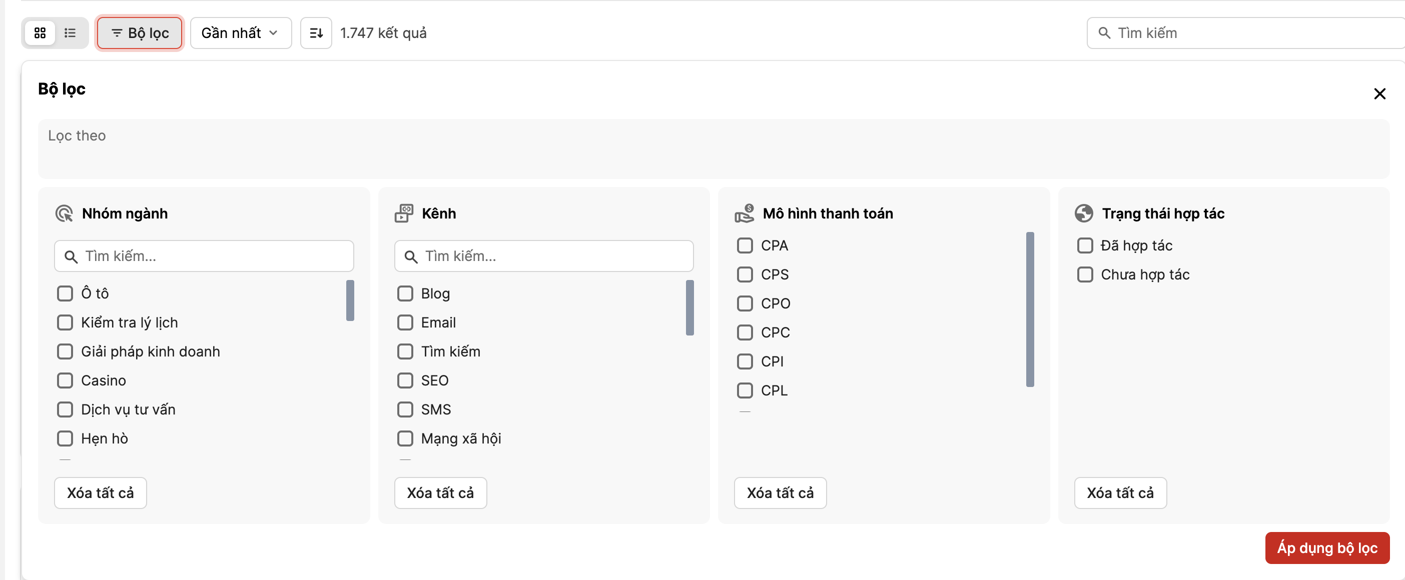 - Ngành hàng: Lọc theo ngành hàng/lĩnh vực (E-commerce, Travel, Finance,…).