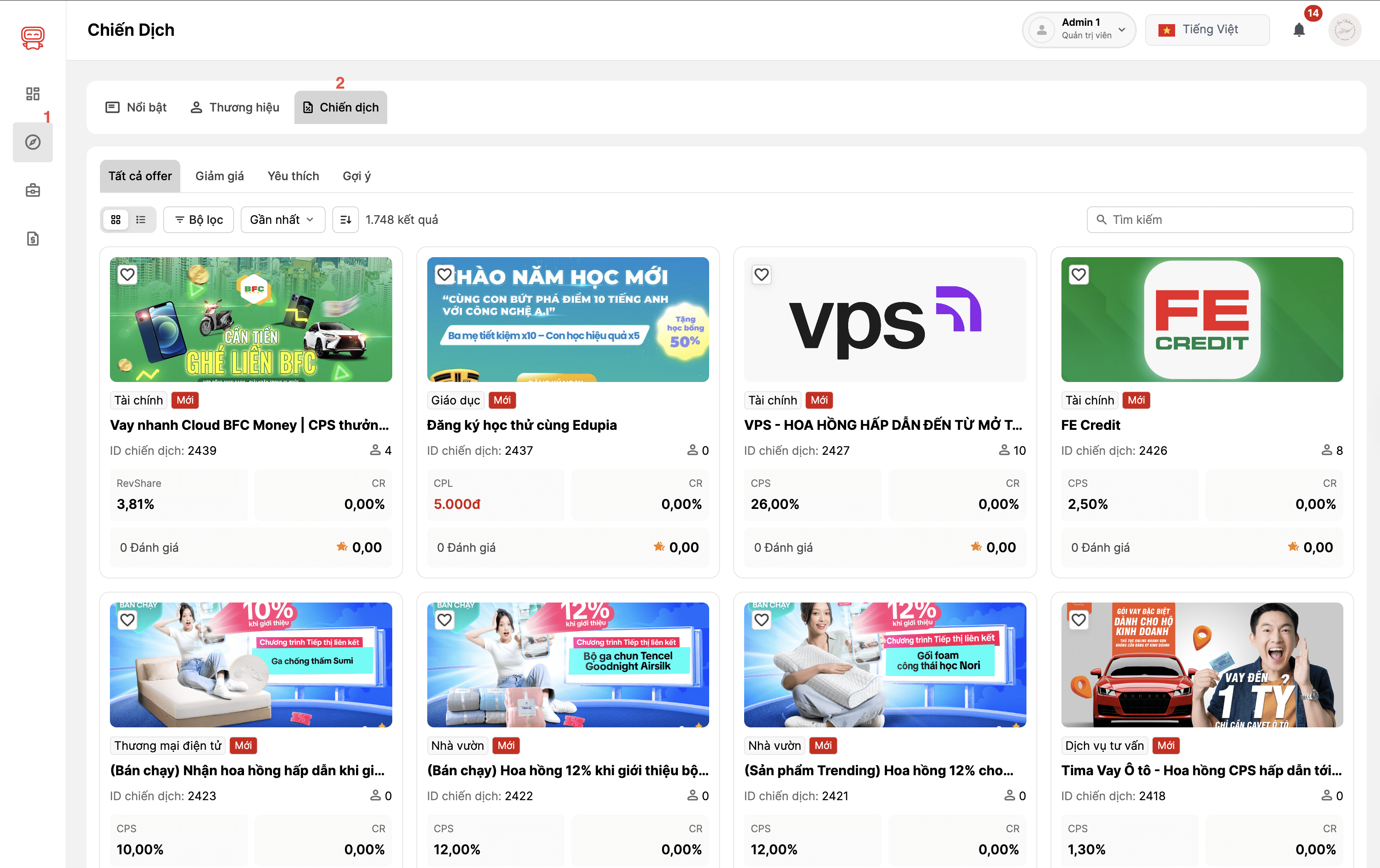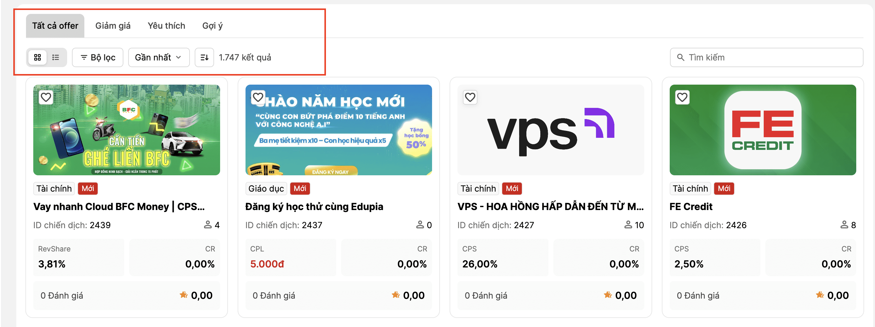 Hiển thị một danh sách đầy đủ các Offer hoặc Chương trình khuyến có trên hệ thống, cho phép Đối tác theo dõi, tìm kiếm, lọc và sắp xếp để tìm ra các cơ hội phù hợp nhất.