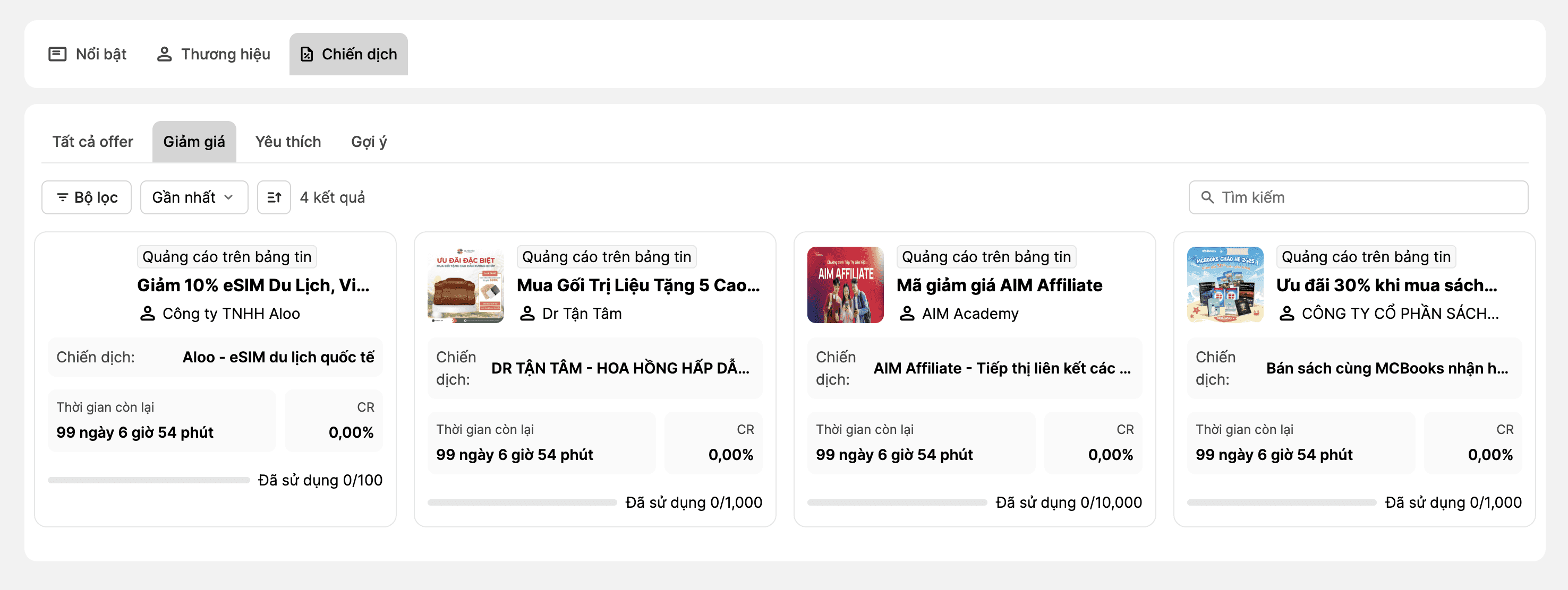 - Giảm giá: Hiển thị các chương trình giảm giá của các chiến dịch tương ứng, bao gồm thông số CR, thời gian sử dụng, lượt sử dụng