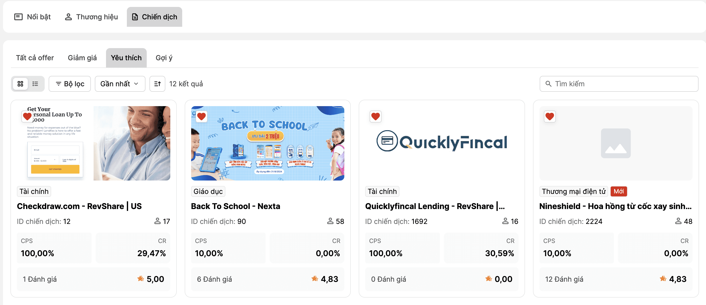 Hiển thị danh sách các chiến dịch đã Yêu Thích, bao gồm các thông tin cơ bản của offer như ID chiến dịch, CPS, CR, điểm đánh giá.