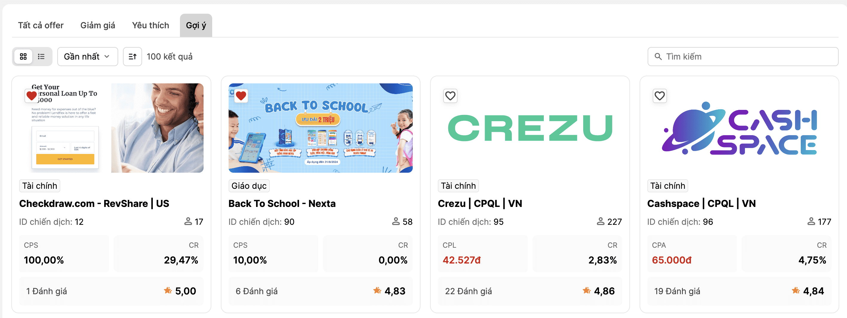 - Đề xuất offer: Khu vực đề xuất các Offer tương tự với ngành hàng mà bạn đã chọn.