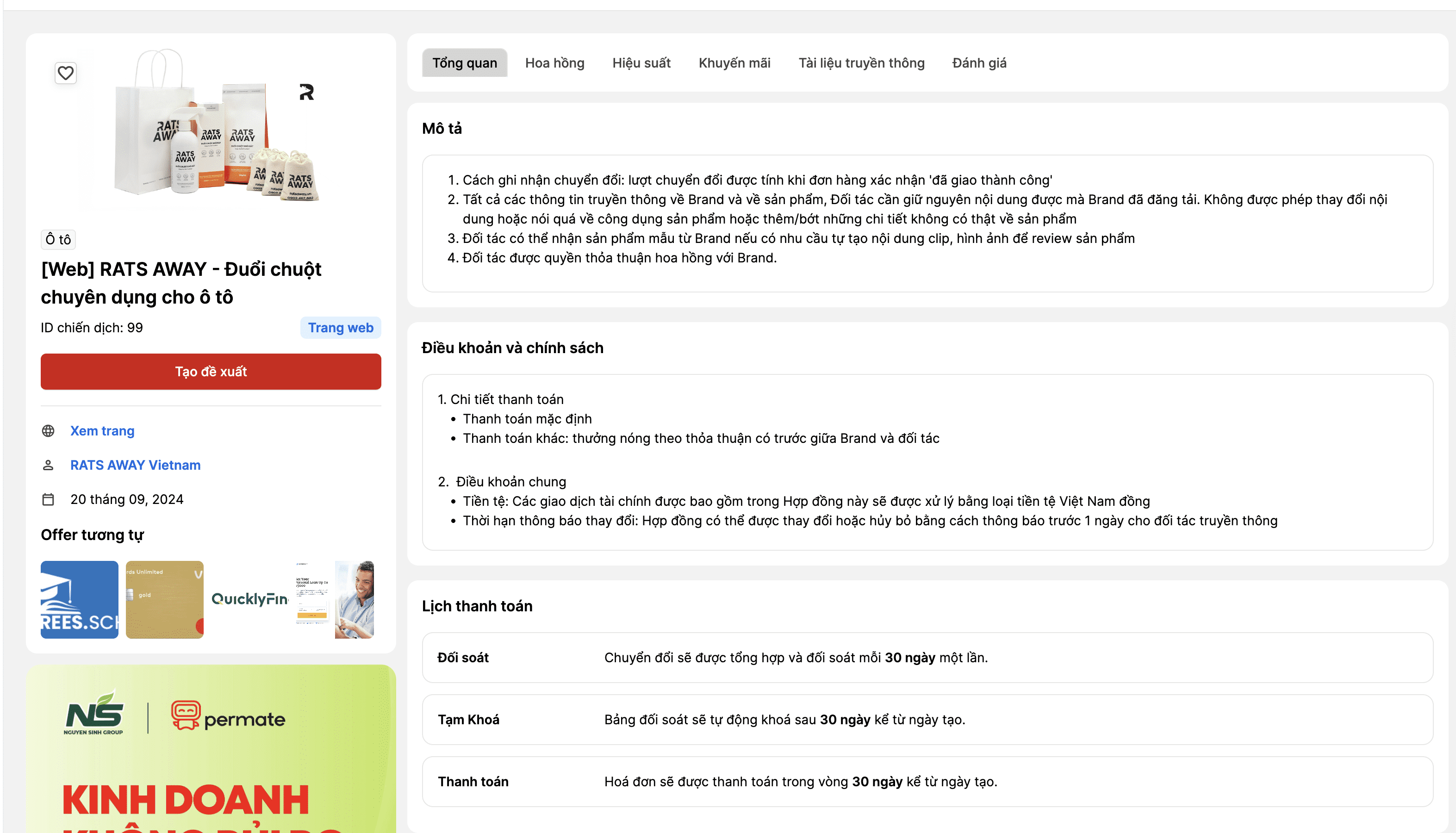 Màn hình Chi tiết Chiến dịch là nơi bạn có thể tìm hiểu sâu về một Offer cụ thể, bao gồm mô tả, chính sách hoa hồng, yêu cầu, dữ liệu hiệu suất, tài nguyên quảng cáo và đánh giá từ các Partner khác.