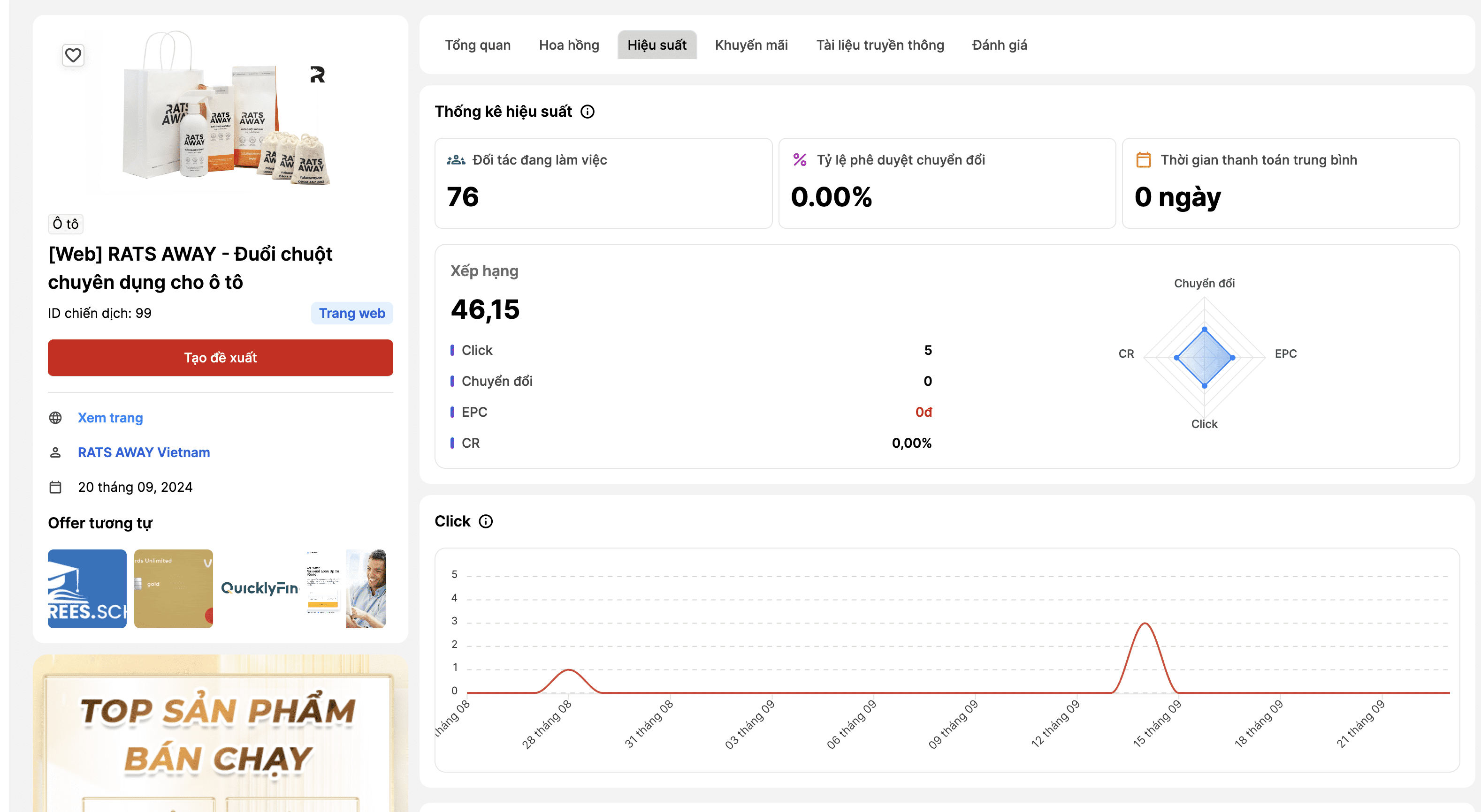 - Điểm đánh giá: so sánh hiệu suất của Offer này với các Offer tương tự trên thị trường (điểm từ 0-100), Hiển thị dữ liệu thống kê hiệu suất của Offer: EPC, CR, click và conversion.