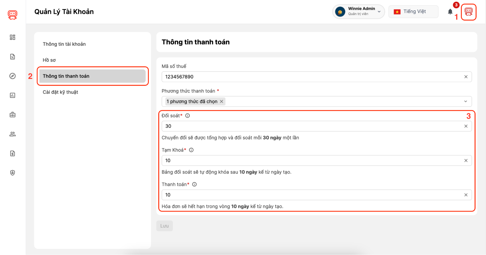 - Bước 4: Nhập số ngày tương ứng vào từng trường: Đối soát, Tạm khoá, Thanh toán.