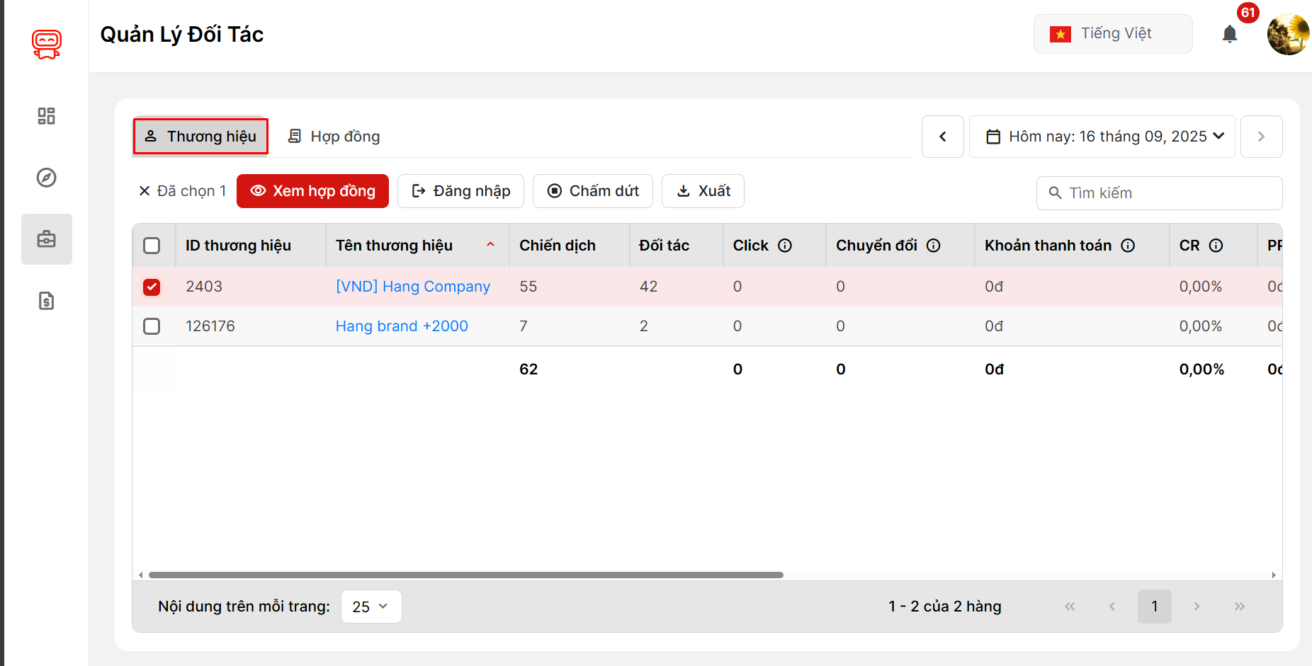 - Chọn tên Brand trong danh sách → bấm Xem hợp đồng