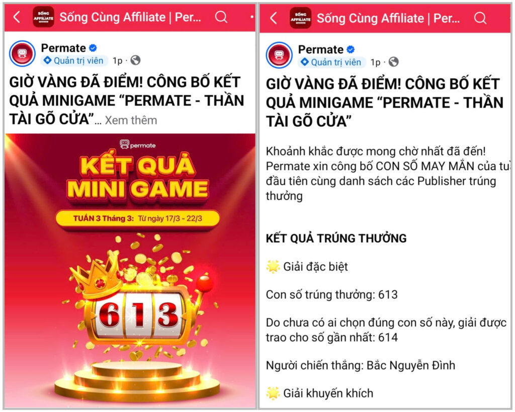 Mọi người join ngay Group chính thức của Permate “Sống Cùng Affiliate” để cập nhật kết quả nhanh nhất về người chiến thắng mỗi tuần, chia sẻ kinh nghiệm & giao lưu cùng cộng đồng kiếm tiền Affiliate nhé!